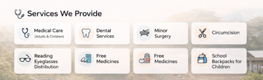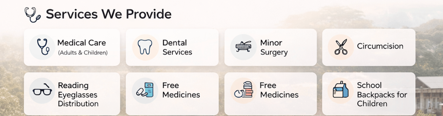 Our team will provide essential services, including medical care for children and adults, dental treatments, minor surgeries, and circumcision. We will also distribute reading eyeglasses, essential medicines, and school backpacks to support both health and education. In addition, we are proud to contribute to the community through our Project School Classroom initiative.